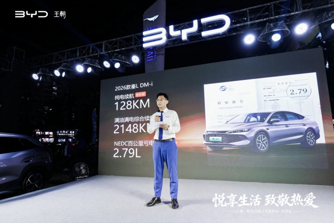 在万众瞩目的揭幕环节,三款新车同步亮相,基于第五代DM技术打造的产品矩阵覆盖中级轿车与主流SUV市场,形成清晰的定位梯度。2026款秦L DM-i以2.79L百公里亏电油耗巩固“轿车省油王”地位,纯电续航达128km,综合续航突破2148km,搭配电子怀挡设计优化座舱空间利用率 ;宋Pro DM-i则以3.2L超低油耗与133km纯电续航,成为都市家庭的高性价比之选,多连杆独立悬架升级进一步提升驾乘舒适性;宋L DM-i作为焦点车型实现七大维度焕新,200km纯电续航与1630km综合续航彻底消除里程焦虑,云辇-C智能阻尼系统、TBC爆胎稳行系统等配置全系标配,26英寸大屏抬头显示与燕飞利仕音响更强化智能座舱沉浸感 。
